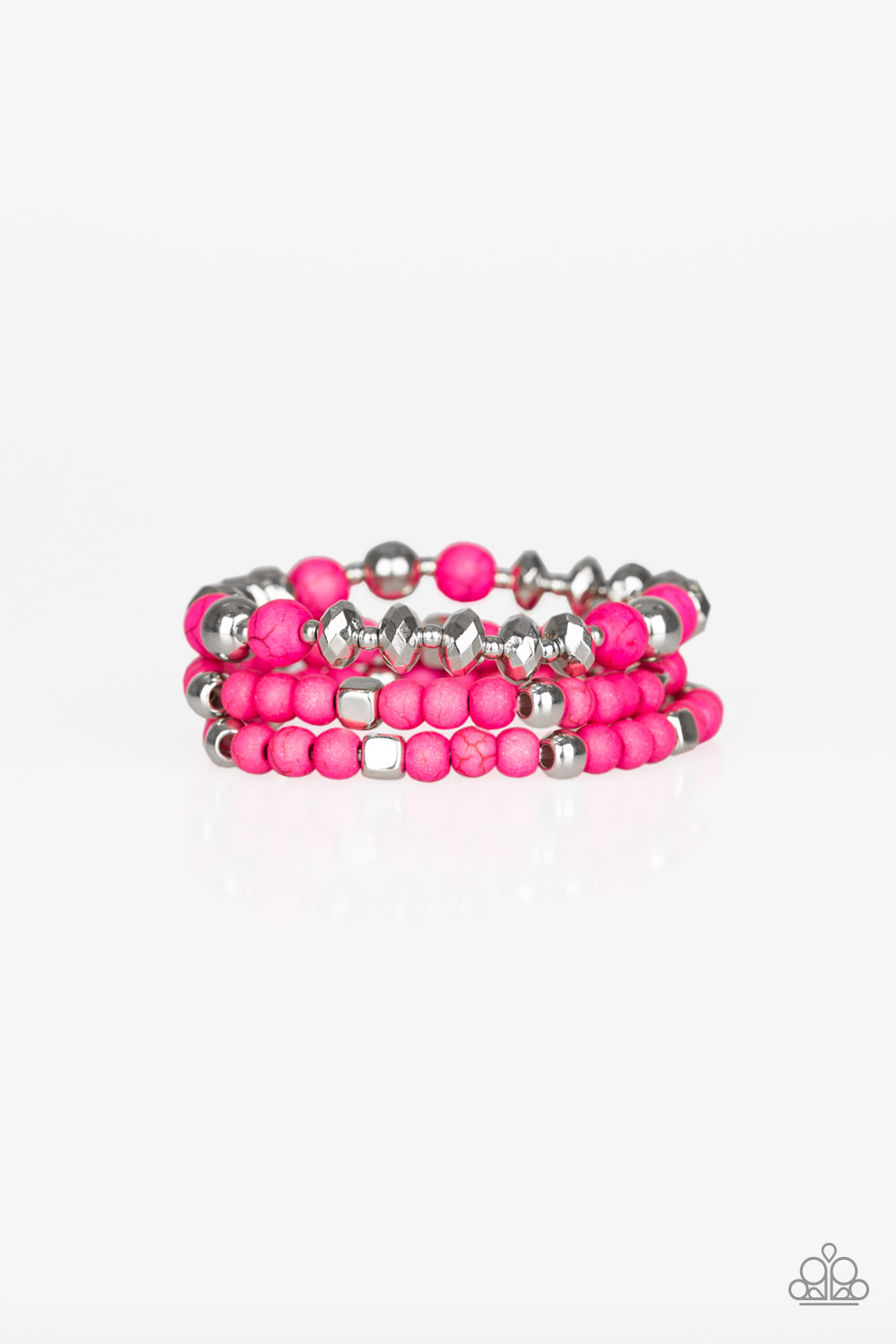 A collection of vivacious pink stones, faceted pink beads, and shimmery silver accents are threaded along stretchy bands, creating colorful layers around the wrist.