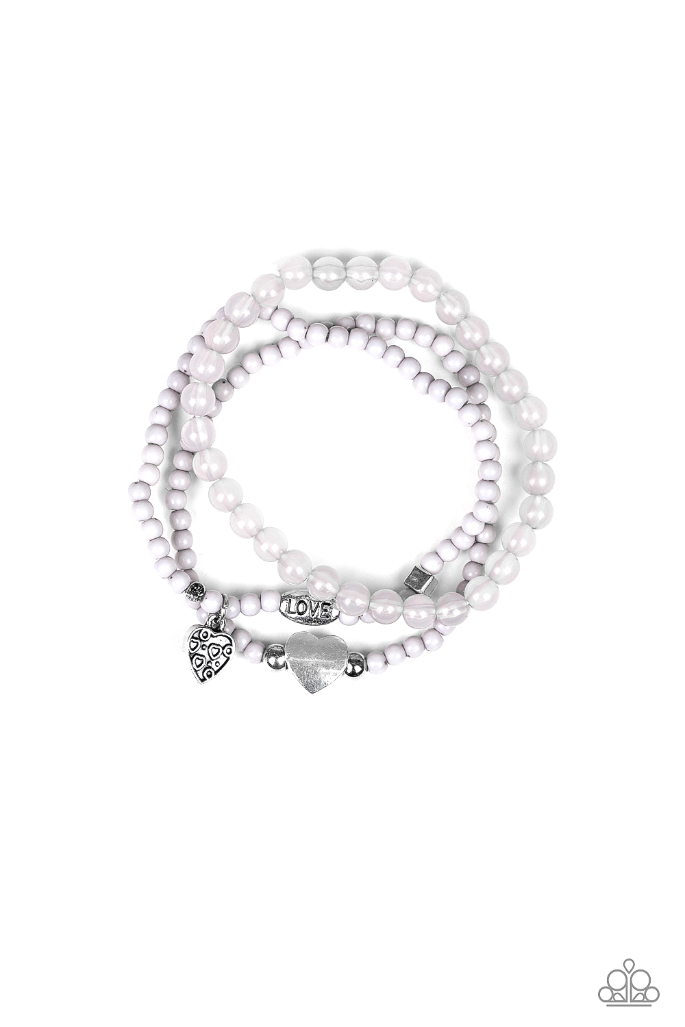 An array of glassy and polished gray beads are threaded along stretchy bands. Infused with silver accents, a collection of silver heart charms and a bead spelling out the word, "love", adorn the beaded strands for a romantic finish.