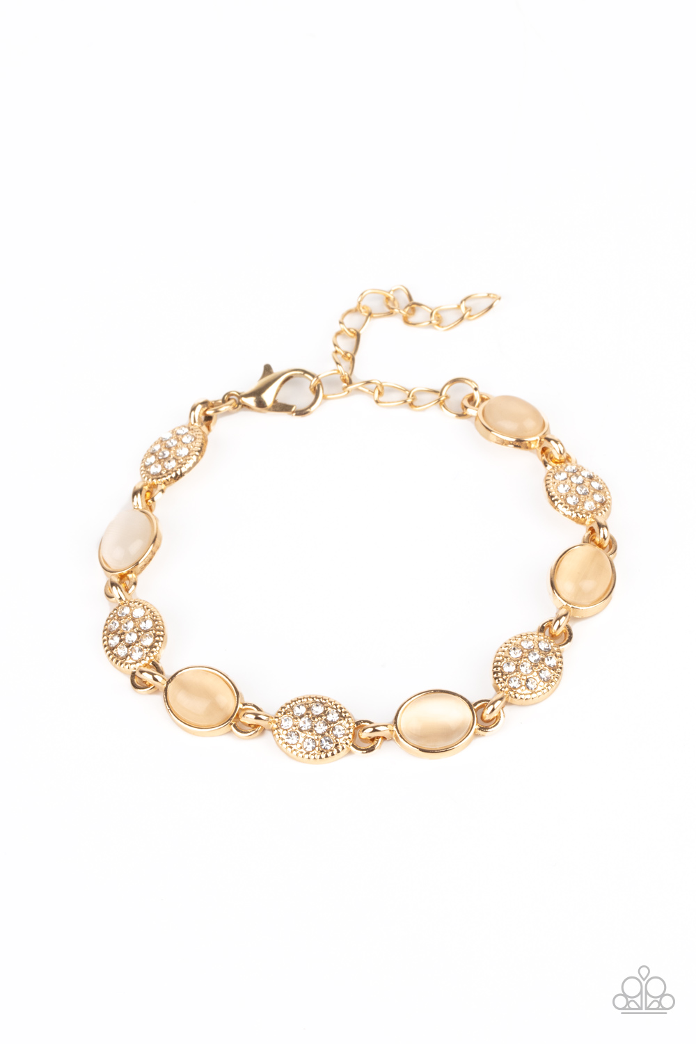 Dainty white rhinestone encrusted gold frames alternate with golden cat's eye encrusted frames around the wrist, creating a timeless centerpiece. Features an adjustable clasp closure.