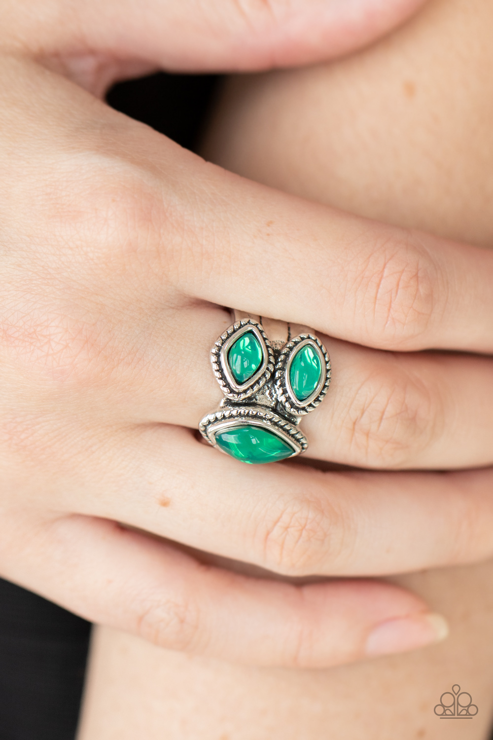A trio of glassy Mint marquise beads embellish the front of a hammered silver band etched in faux layers, creating an ethereal display atop the finger. Features a stretchy band for a flexible fit.