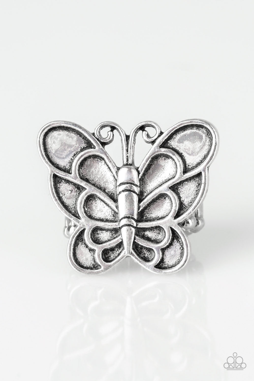 Brushed in an antiqued finish, a dramatic silver butterfly blooms across the finger for a whimsical look. Features a stretchy band for a flexible fit.