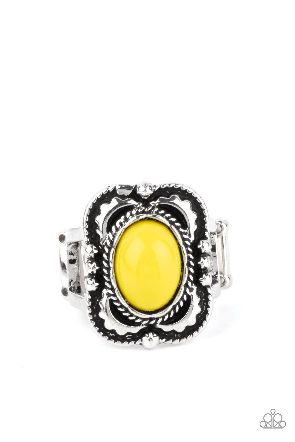 A flamboyant yellow bead is encircled inside a metallic ropelike fitting atop a decoratively embossed silver frame, creating a vivacious pop of color. Features a stretchy band for a flexible fit.