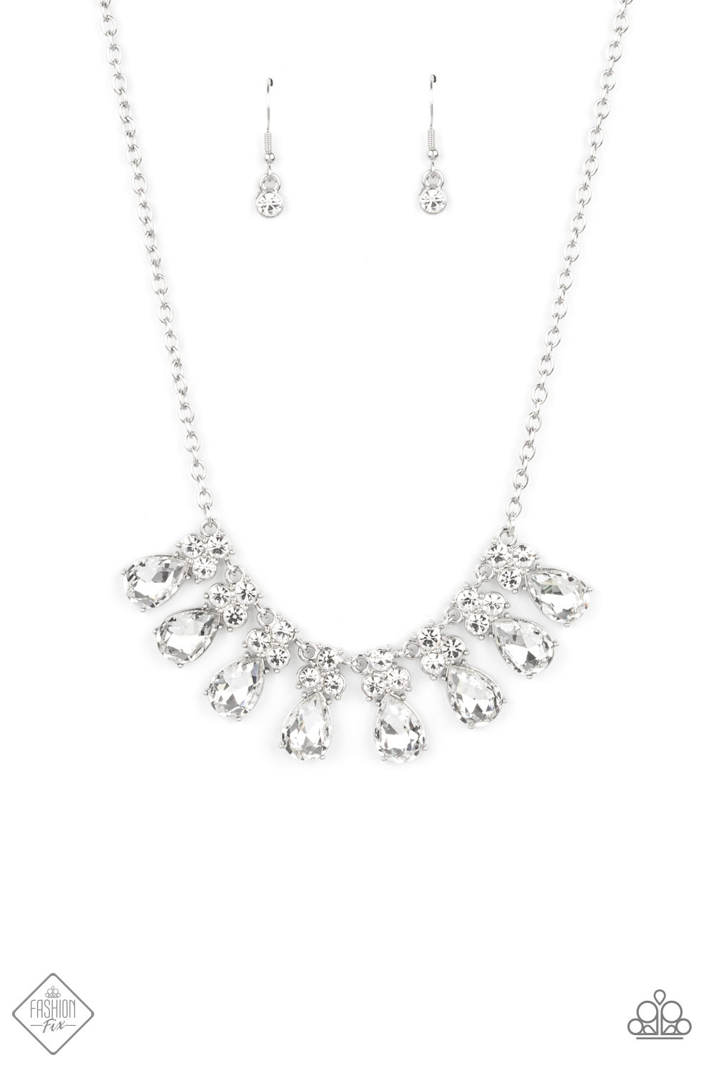 Crowned with trios of glassy white rhinestones, sparkly white teardrops link below the collar, creating a dramatically dazzling fringe. Features an adjustable clasp closure.