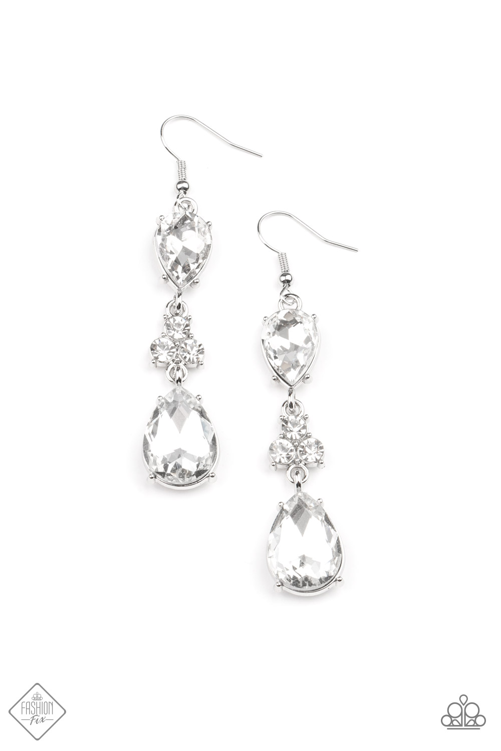 A trio of dazzling white rhinestones unites two white teardrop gems as they dangle brilliantly from the ear for a flawless finish. Earring attaches to a standard fishhook fitting.