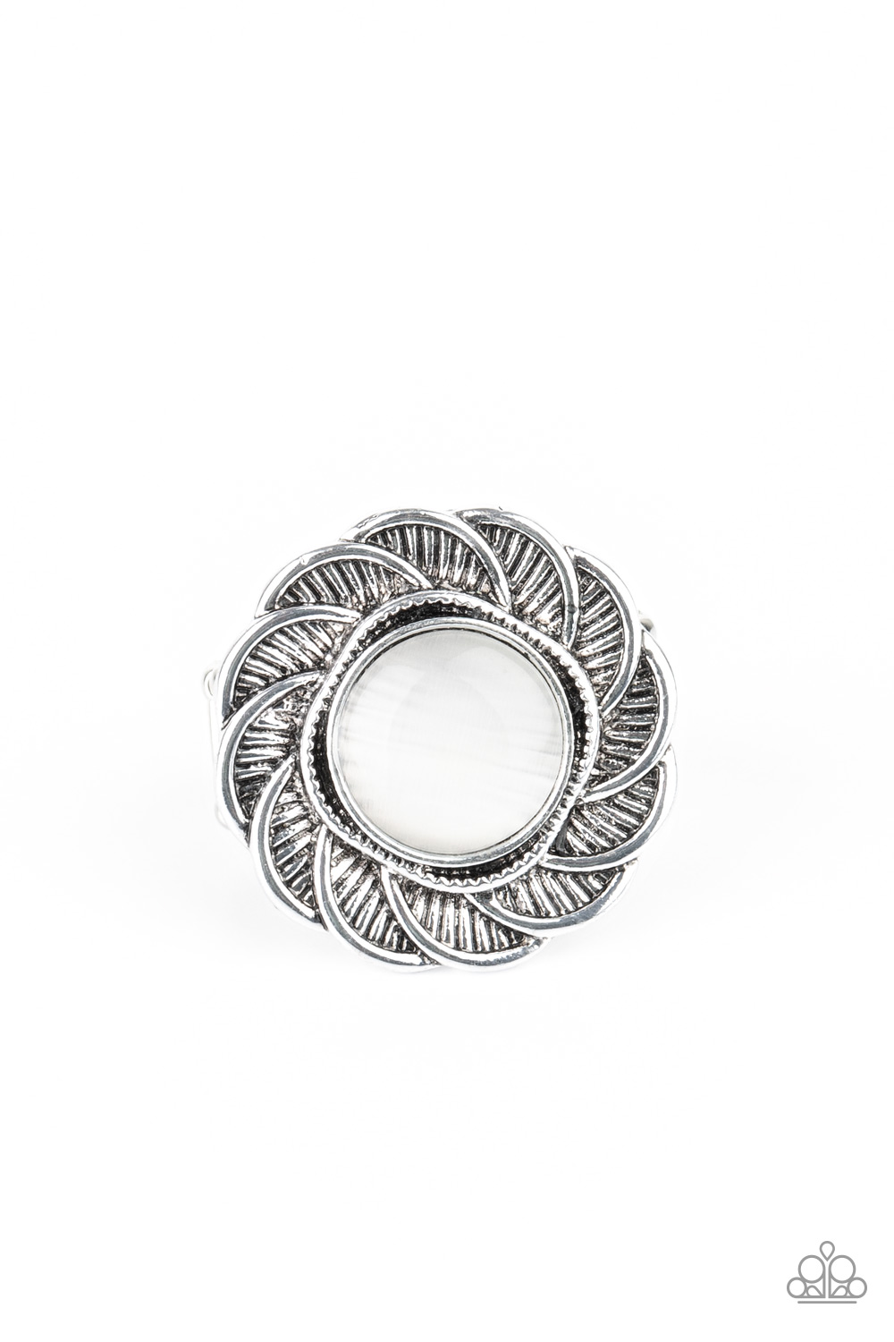A glowing white moonstone is pressed into the center of a floral frame radiating with textured silver petals for a seasonal look. Features a stretchy band for a flexible fit.