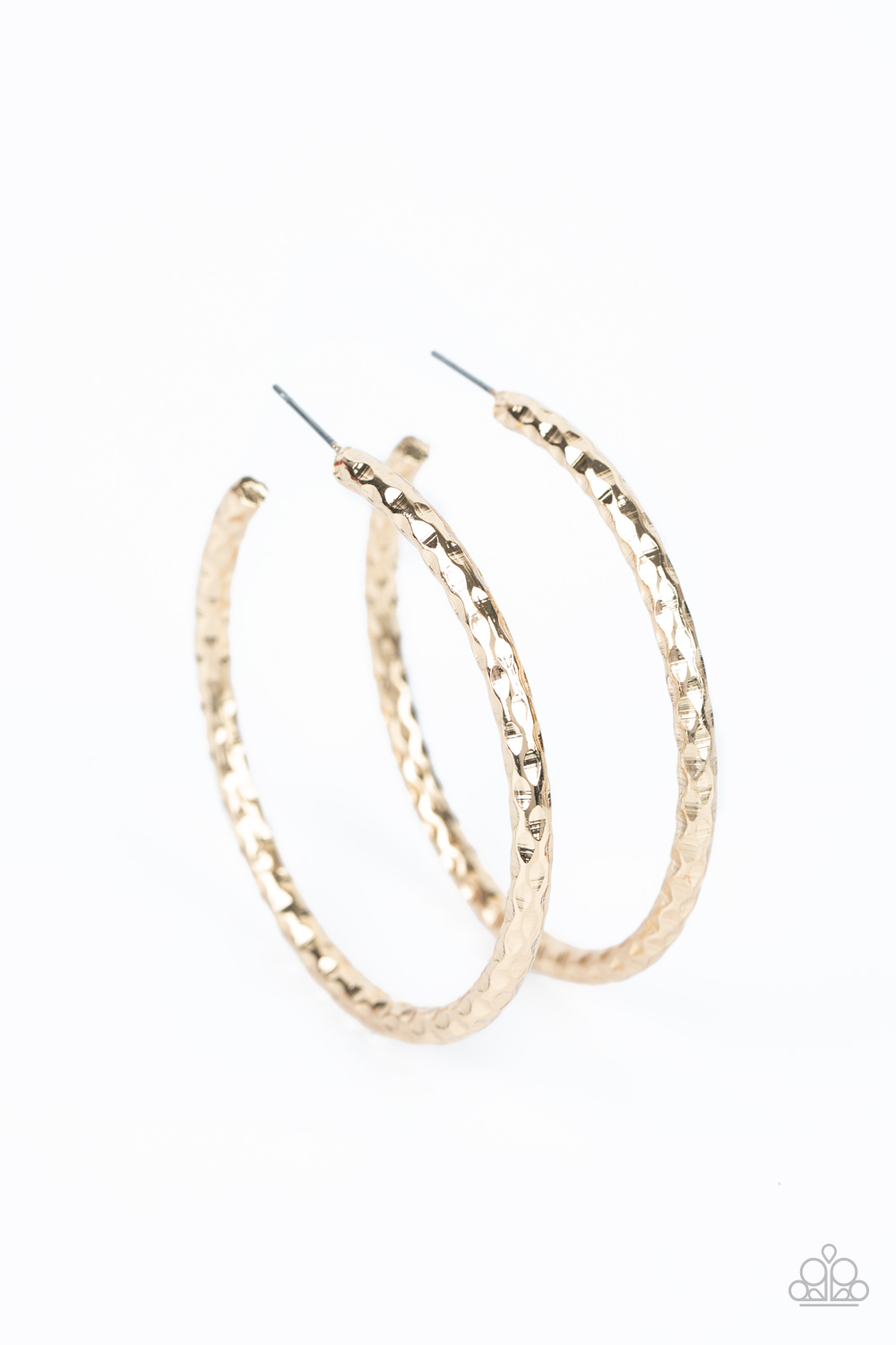 Hammered in blinding shimmer, a thick gold hoop curls around the ear for an edgy, urban look. Earring attaches to a standard post fitting. Hoop measures approximately 2" in diameter.
