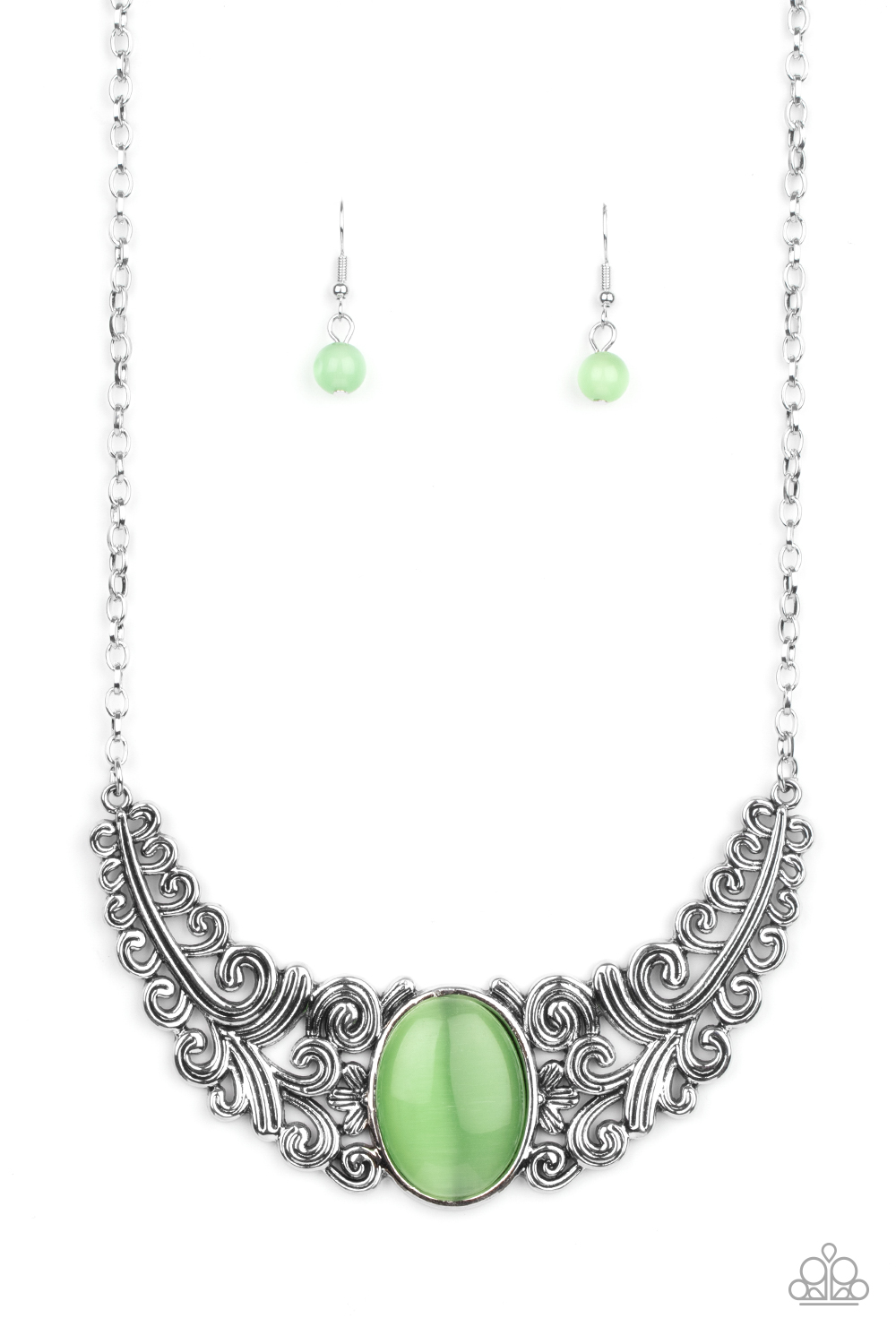 Featuring vine and floral details, leafy silver frames branch out from an oversized green cat's eye stone center, creating a dramatically whimsical centerpiece below the collar. Features an adjustable clasp closure.