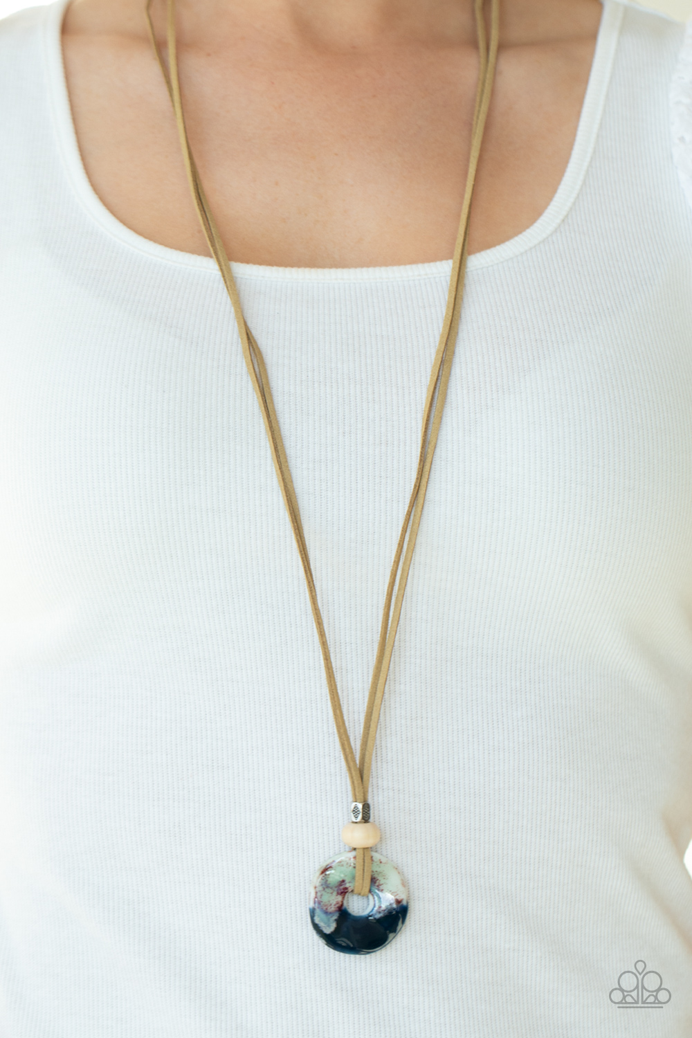 Infused with wooden and silver beads, an asymmetrical ceramic disc swings from the bottom of lengthened strands of tan suede for a colorfully earthy look. Features an adjustable clasp closure.