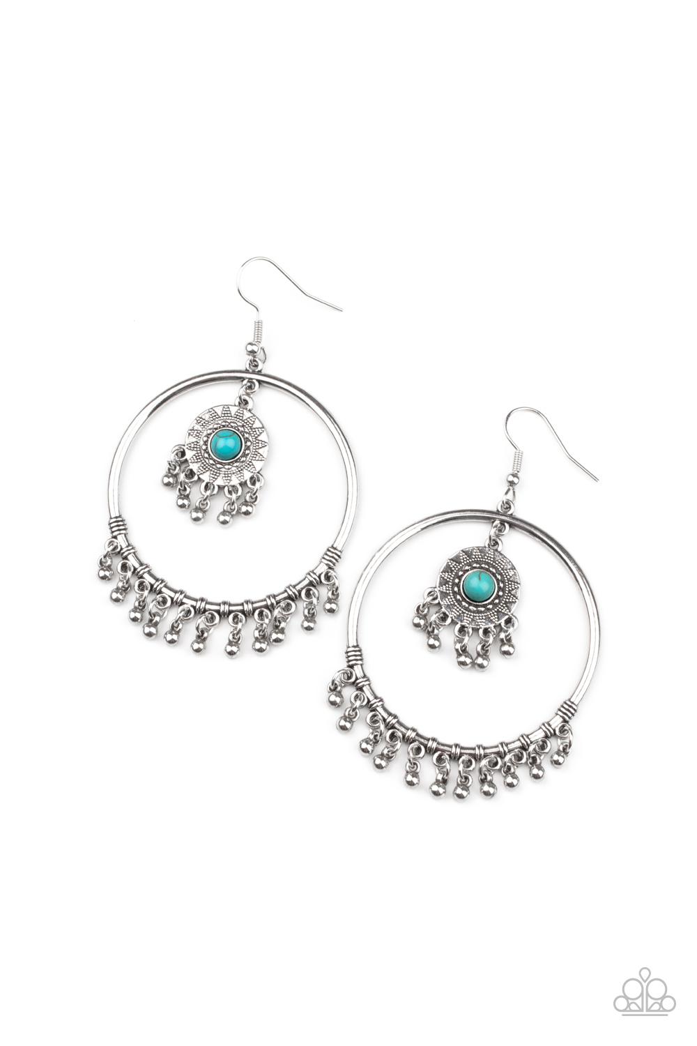 Dotted with a turquoise stone, a dainty sunburst studded frame swings from the top of a shiny silver hoop featuring a silver beaded fringe for a trendy stone look. Earring attaches to a standard fishhook fitting.