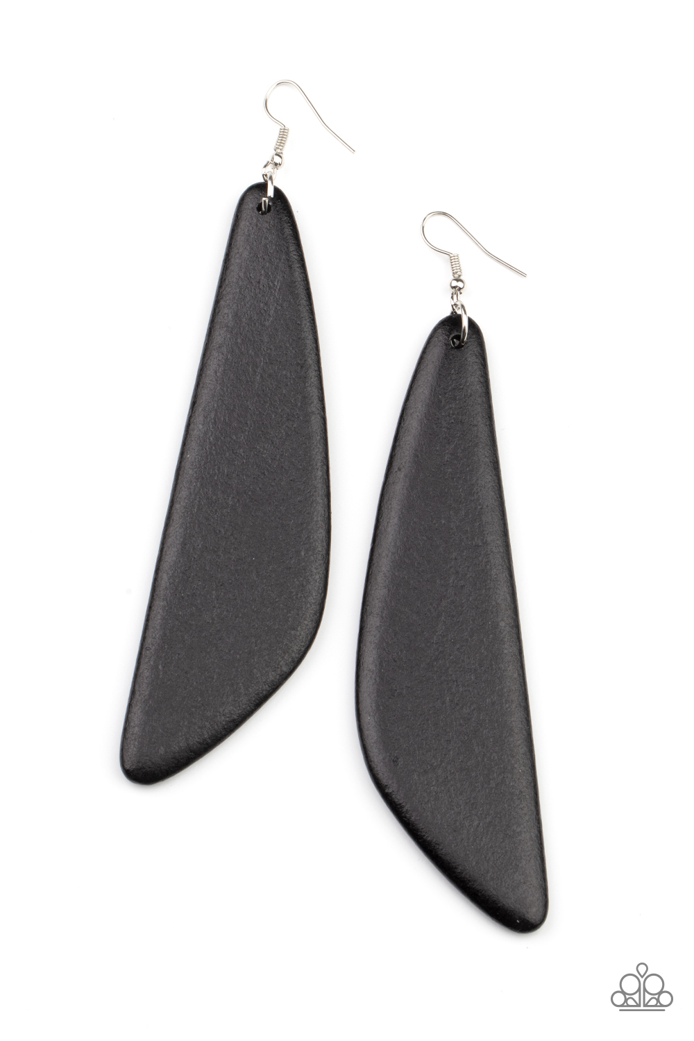 Painted in a shiny black finish, a flared wooden frame swings from the ear for a colorful summery look. Earring attaches to a standard fishhook fitting.