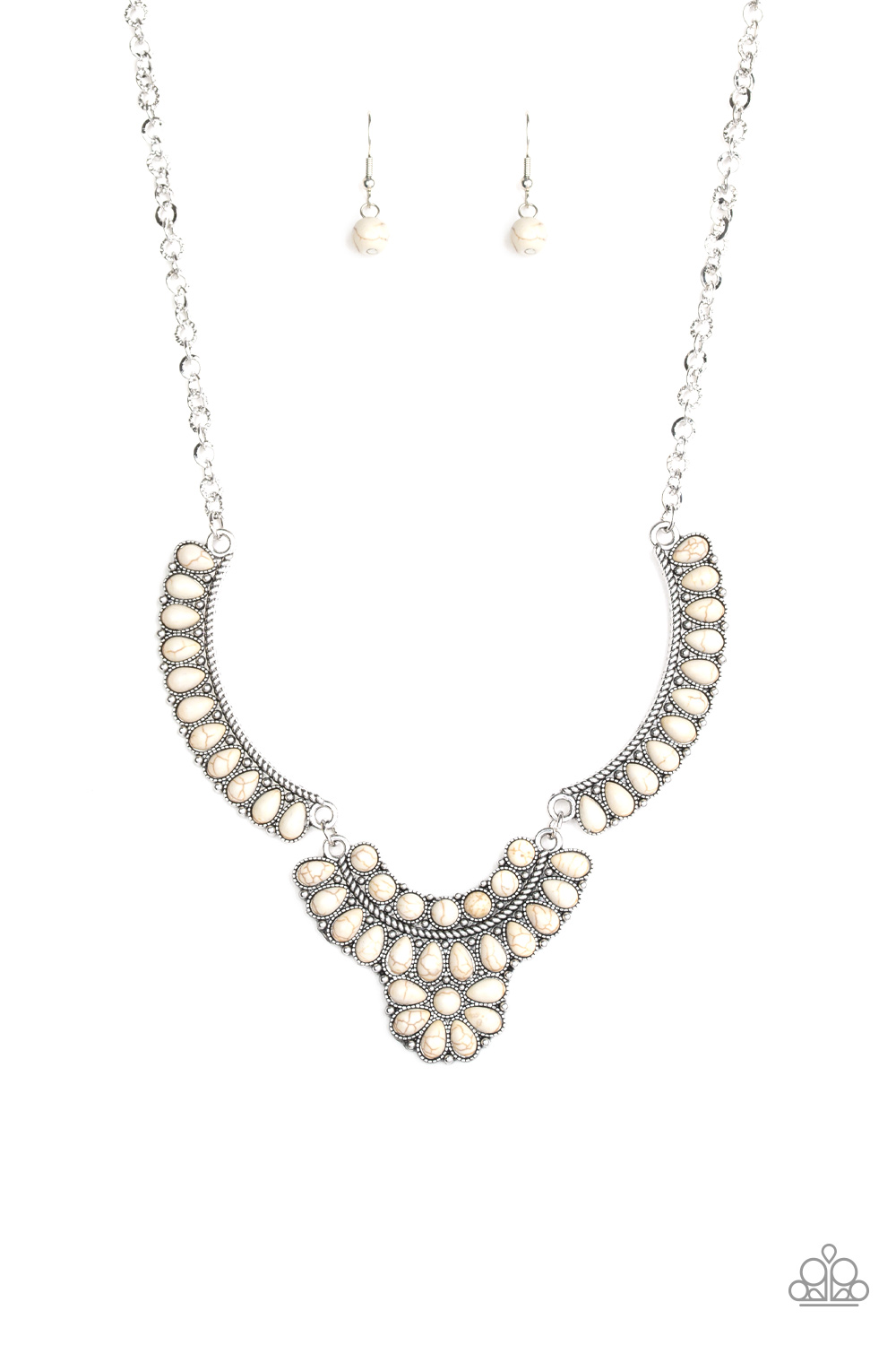 Featuring round and teardrop shapes, a collection of tranquil white stone beads are pressed into interconnected silver plates, creating a refreshing floral inspired statement piece below the collar. Features an adjustable clasp closure.