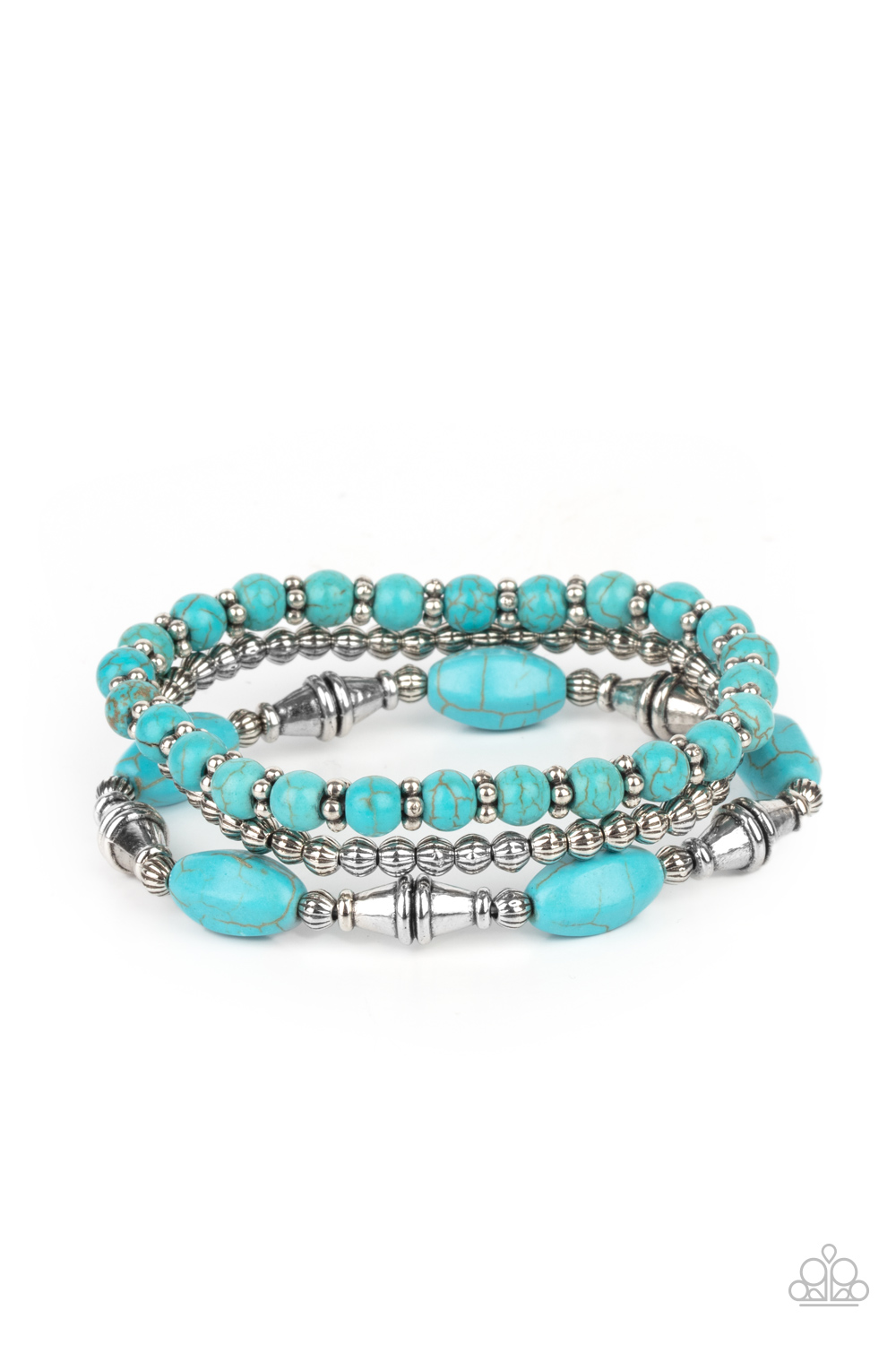An earthy collection of mismatched turquoise stone and ornate silver beads are threaded along stretchy bands around the wrist for a colorful artisan flair.