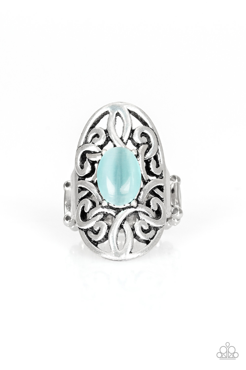A glowing blue cat's eye stone is pressed into the center of an oval backdrop swirling with vine-like filigree for a whimsical look. Features a stretchy band for a flexible fit.