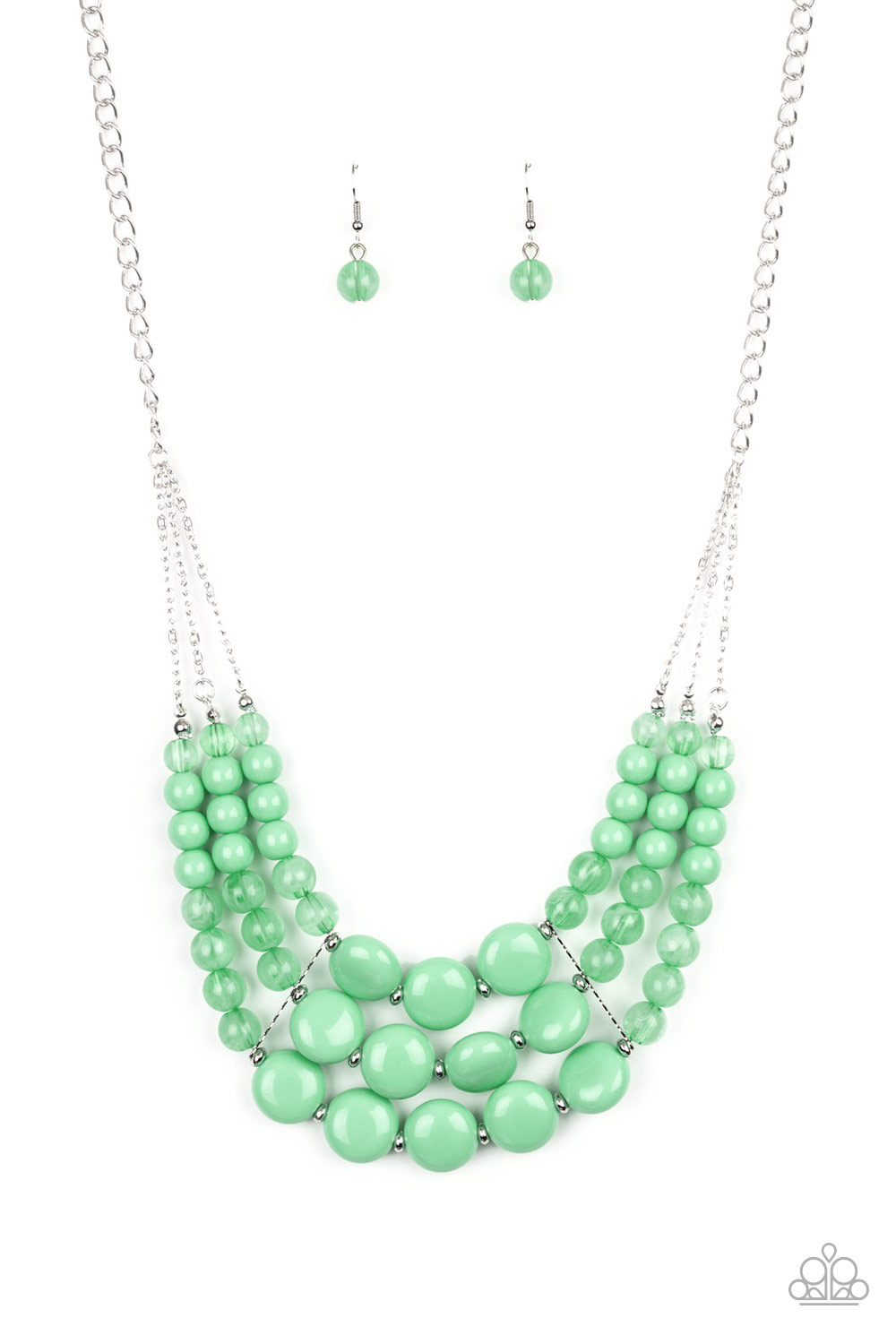 Featuring polished and opaque finishes, strands of round and flat Biscay Green beads are threaded along invisible wires below the collar, creating refreshing bubbly layers. Features an adjustable clasp closure.