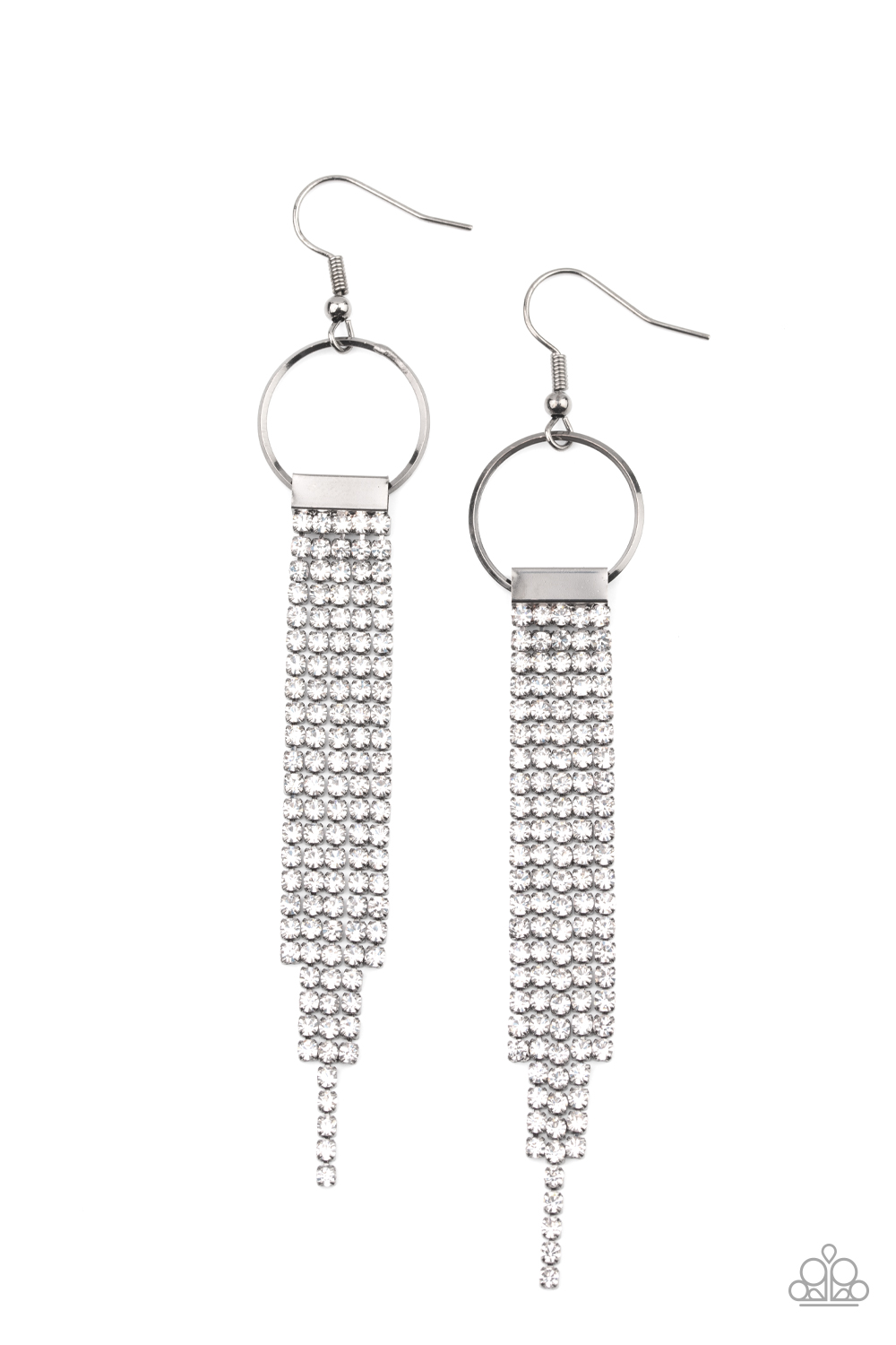 Dainty strands of glittery white rhinestones stream from the bottom of a silver fitting that glides along the bottom of a dainty silver hoop, creating a timelessly tapered fringe. Earring attaches to a standard fishhook fitting.
