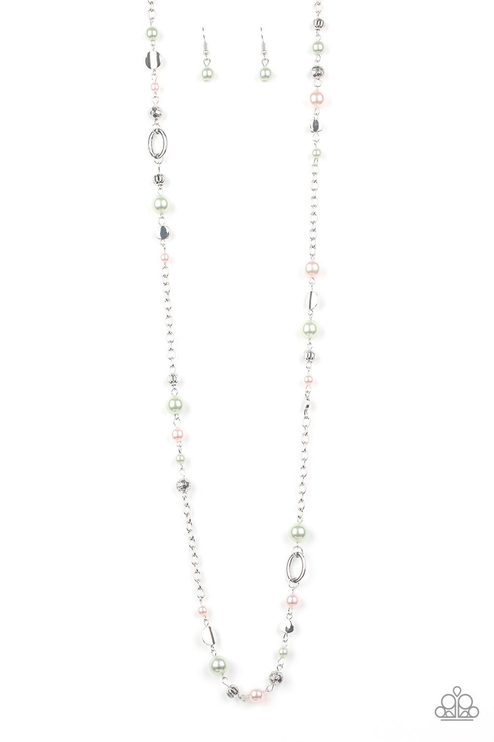 A collection of mismatched silver accents and pearly pink and green beads trickle along a shimmery silver chain for a sophisticated look. Features an adjustable clasp closure.
