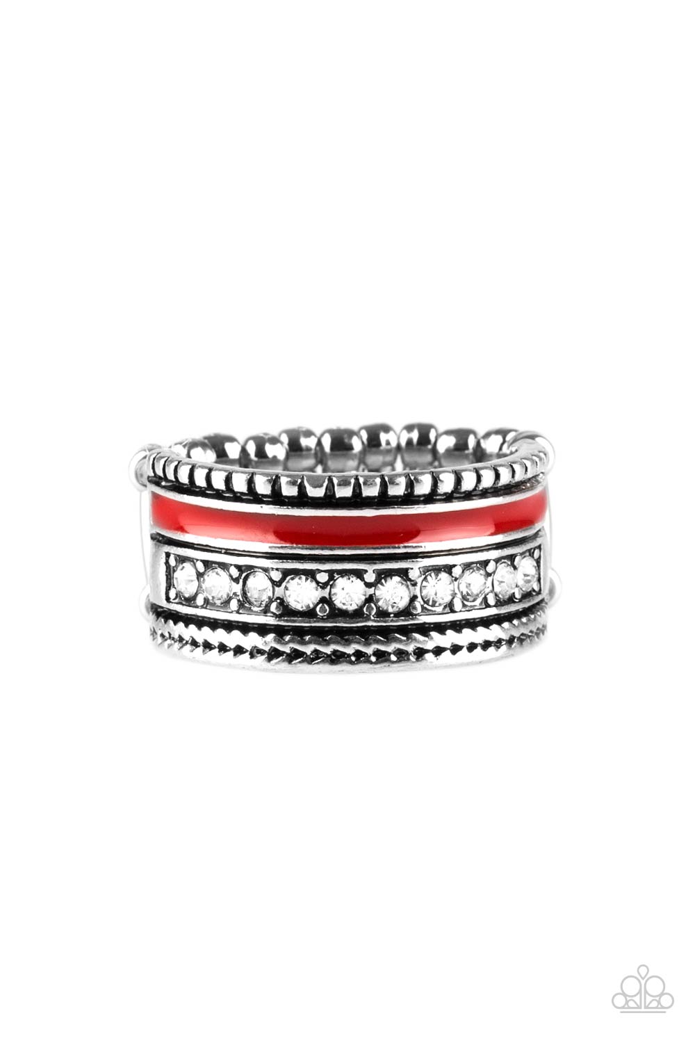 A shiny red strip of color runs along the bottom of a row of glassy white rhinestones. Infused with silver textures, the mismatched details coalesce into one thick band across the finger. Features a stretchy band for a flexible fit.