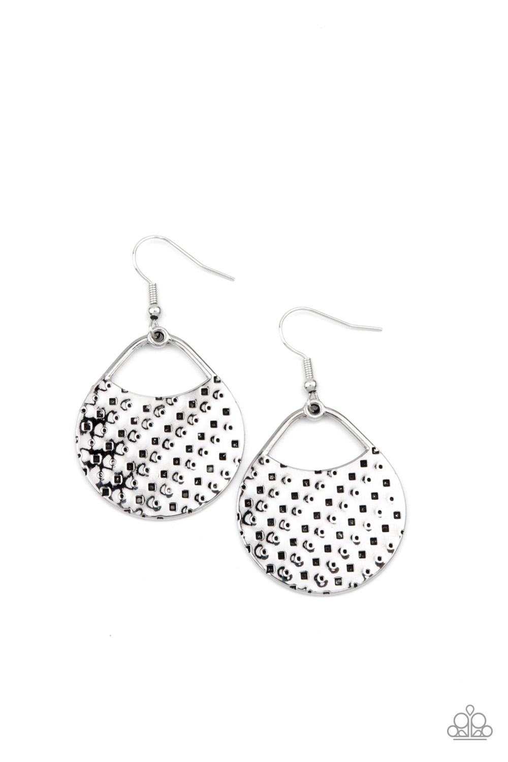 The front of a uniquely shaped silver frame is stamped and hammered in slanting rows of square and dotted patterns for a one-of-a-kind look. Earring attaches to a standard fishhook fitting.