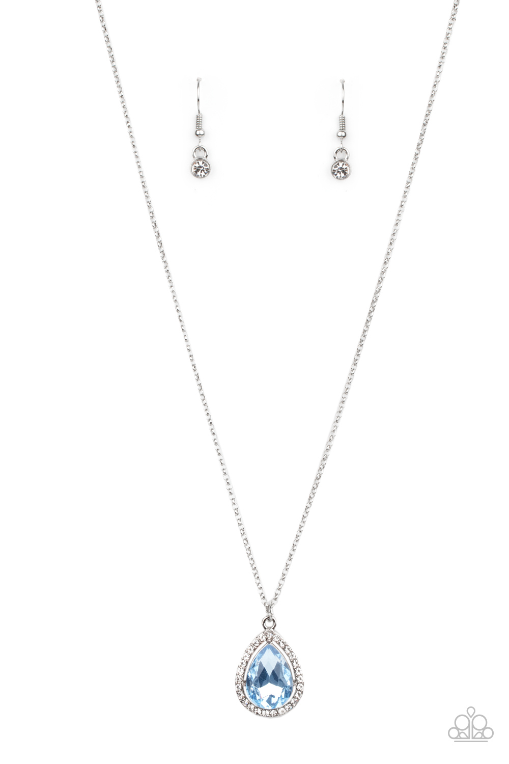 An oversized Cerulean rhinestone teardrop is pressed into the center of a silver frame bordered in white rhinestones, creating a glamorous pendant below the collar. Features an adjustable clasp closure.