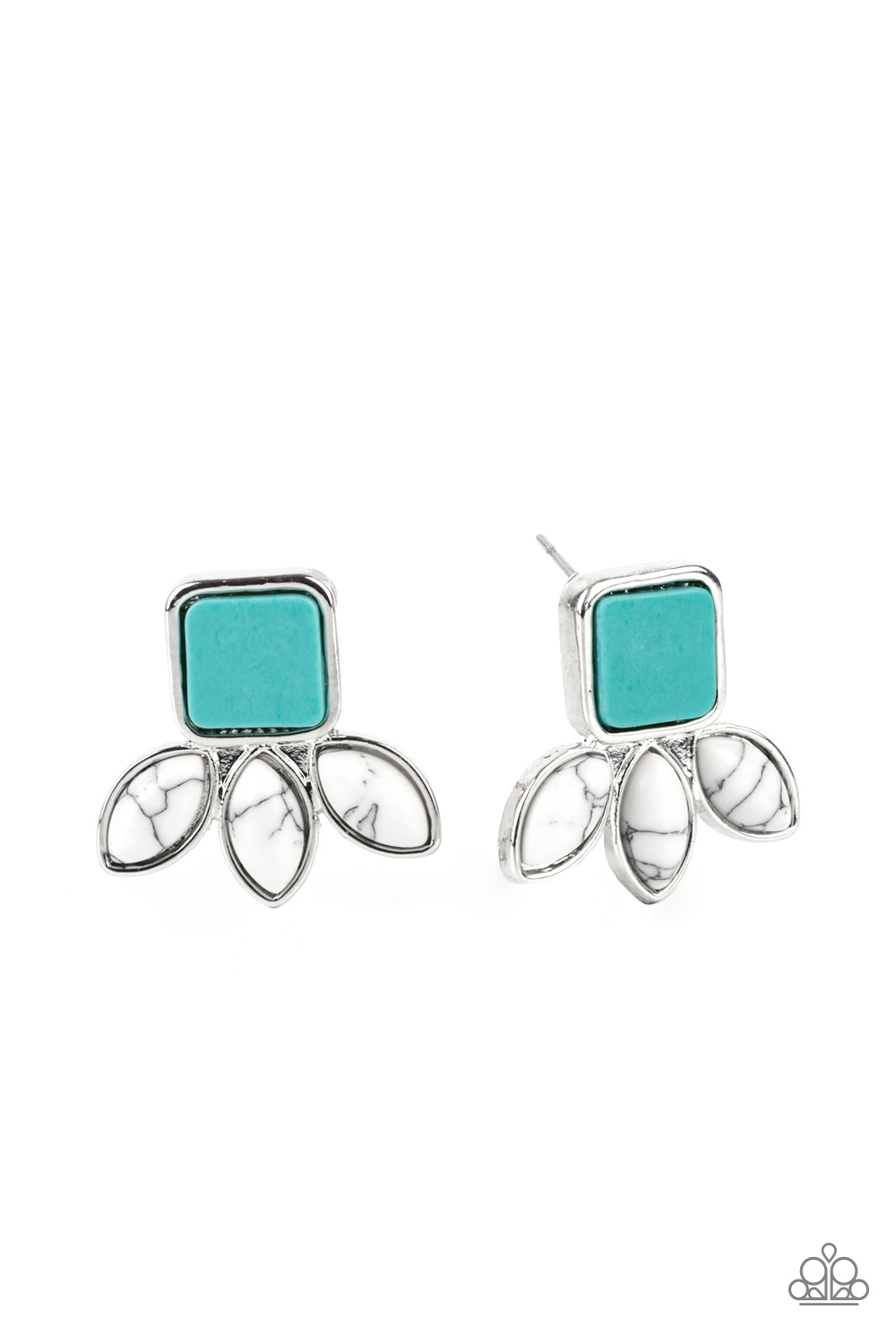 Encased in sleek silver frames, a trio of marquise white stones fan out from the bottom of a square turquoise stone for an earthy flair. Earring attaches to a standard post fitting.