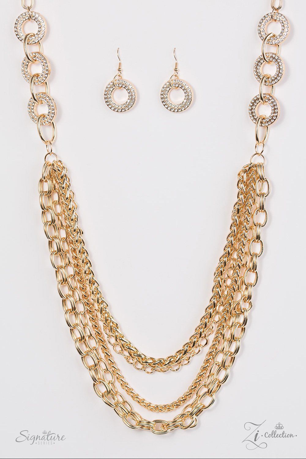 The Melissa Encrusted in glittery white rhinestones, glistening gold frames give way to layers of shimmery gold chains. Varying in size and shimmer, the bold assortment of gold chains drape across the chest in a fierce and flawless fashion. Features an adjustable clasp closure.Named after 2017 Rock the Runway winner, Melissa P. Sold as one individual necklace. Includes one pair of matching earrings.