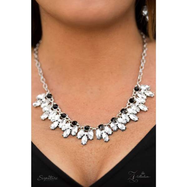 Featuring regal marquise cuts, glittery white rhinestones flare from the bottom of classic black rhinestones, linking into a fringe of elegant frames below the collar in a timeless fashion. Features an adjustable clasp closure.