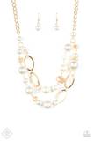 A glamorous collection of champagne crystal-like beads, shiny gold ovals, and oversized white pearls delicately connect into two bubbly layers below the collar for an effortless glow. Features an adjustable clasp closure.