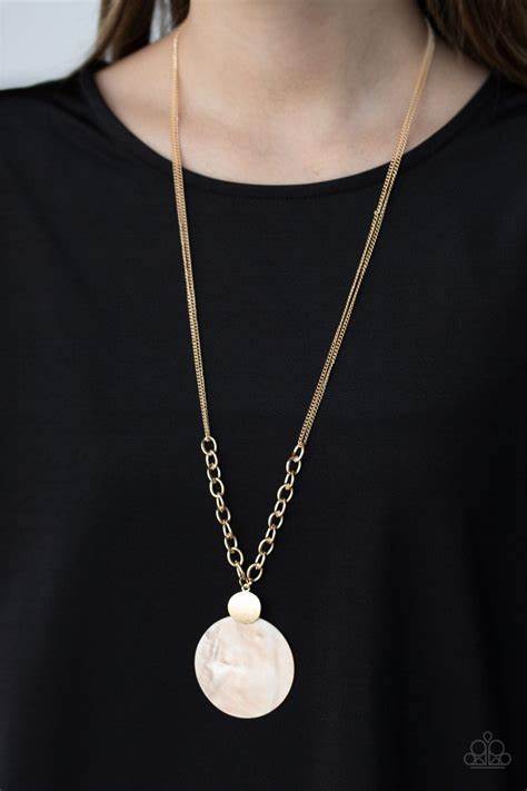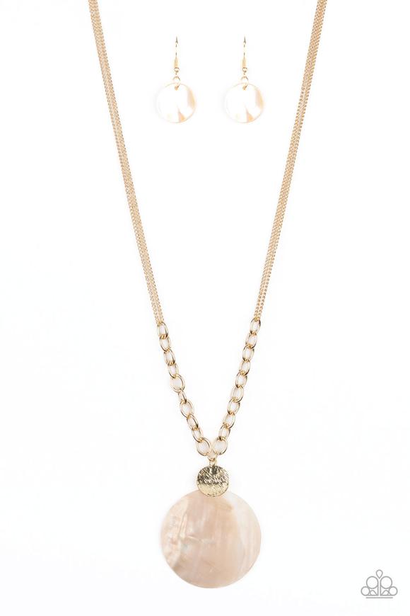 A textured gold disc links with a shell-like frame at the bottom of a section of thick gold chain, creating a summery pendant. Features an adjustable clasp closure.Sold as one individual necklace. Includes one pair of matching earrings.