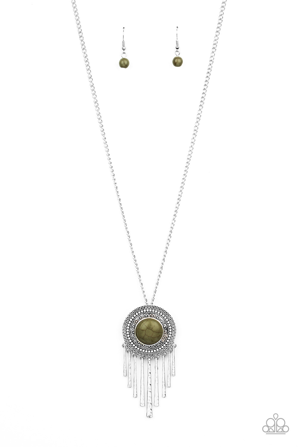An earthy green stone is pressed into the center of a shimmery silver disc radiating with glistening tribal details. Swinging from the bottom of a lengthened silver chain, the bold pendant gives way to a fringe of delicately hammered silver rods for a wanderlust finish. Features an adjustable clasp closure.