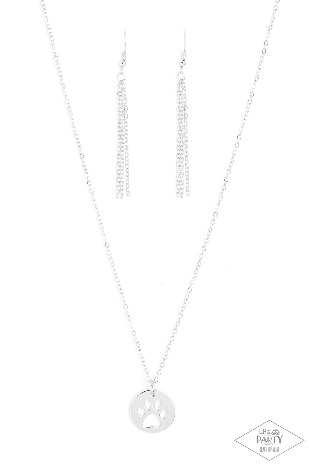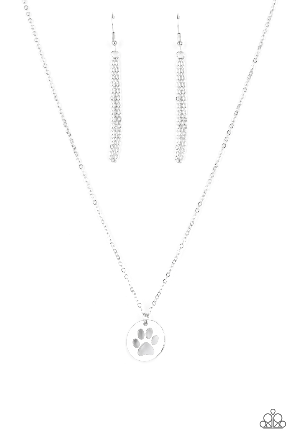 Featuring a pawprint cutout, a shiny silver disc swings from a classic silver chain below the collar, creating a pet-lover inspired pendant. Features an adjustable clasp closure.