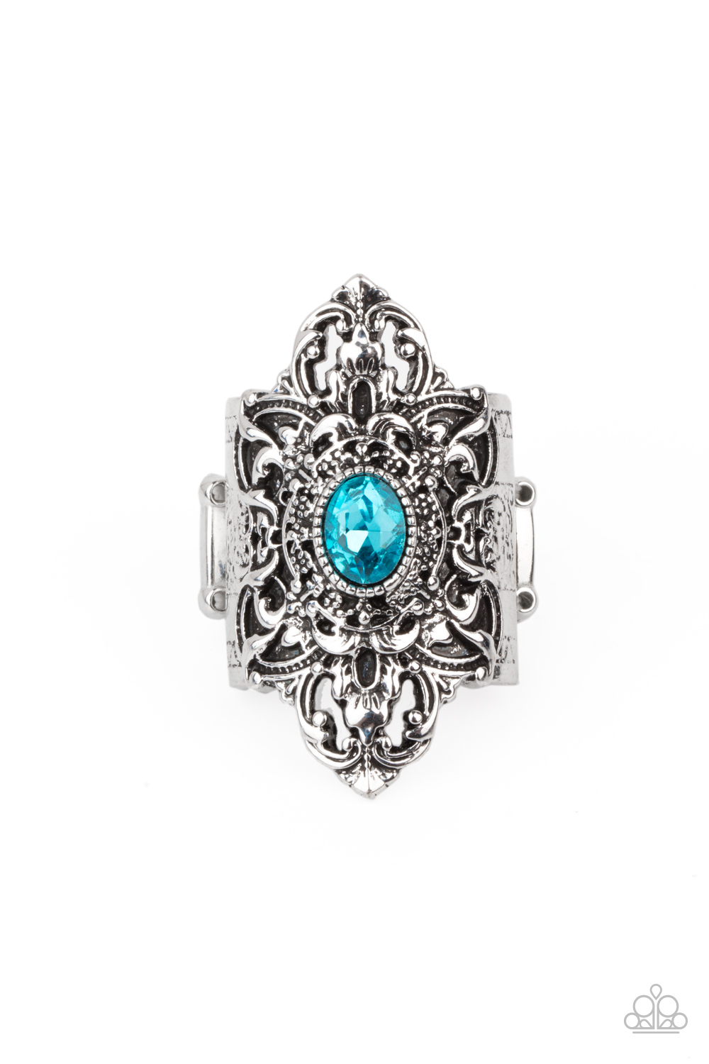 A glittery blue rhinestone adorns the center of a scalloped silver frame that is embossed in a rustic floral backdrop, creating a leafy centerpiece atop the finger. Features a stretchy band for a flexible fit.