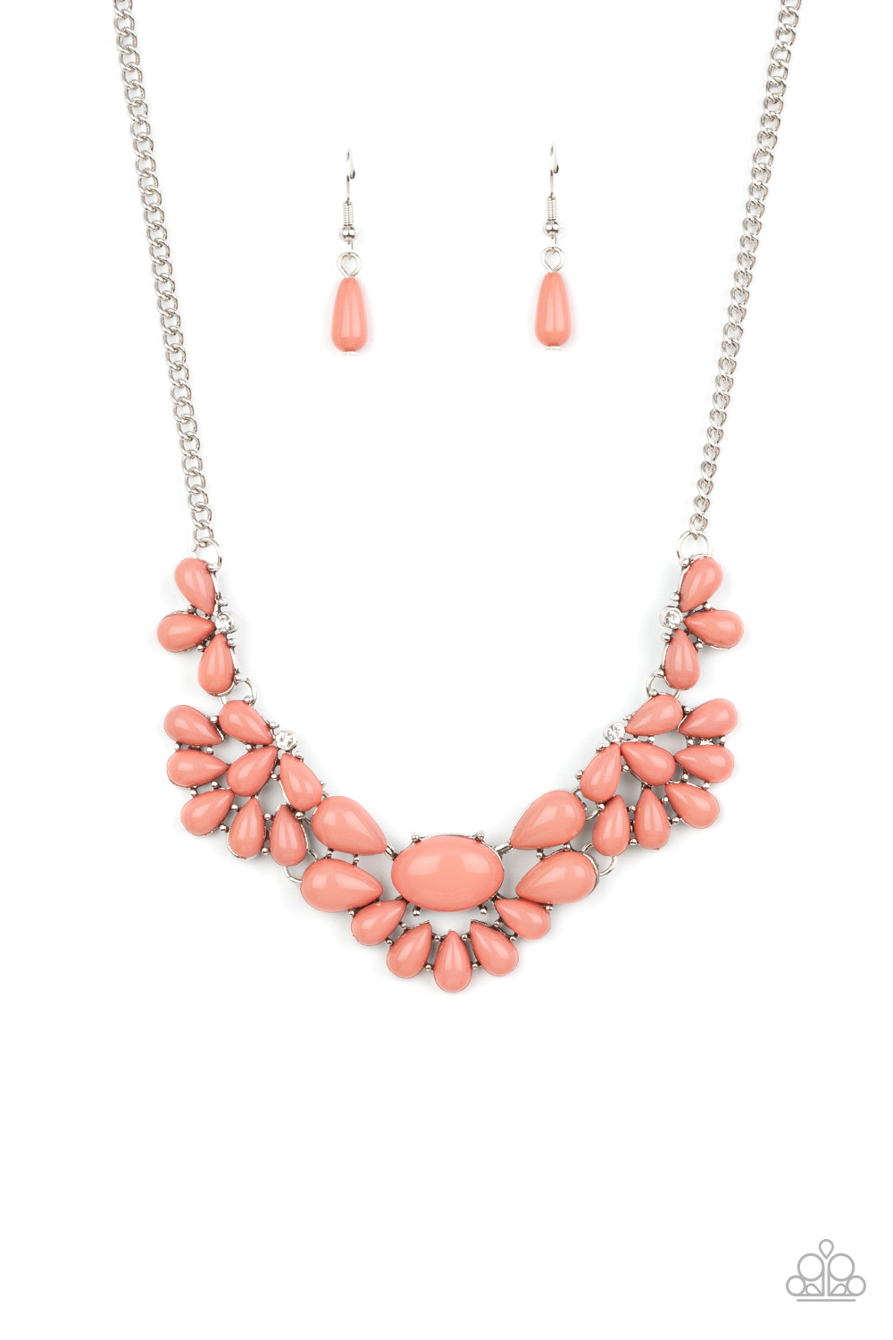 Teardrop Pale Rosette beads fan out from the bottoms of solitaire white rhinestones as they link below the collar, creating whimsically stacked frames. Featuring an oval center, oversized teardrop beads flare out from the centermost frame for a flirtatiously floral finish. Features an adjustable clasp closure.