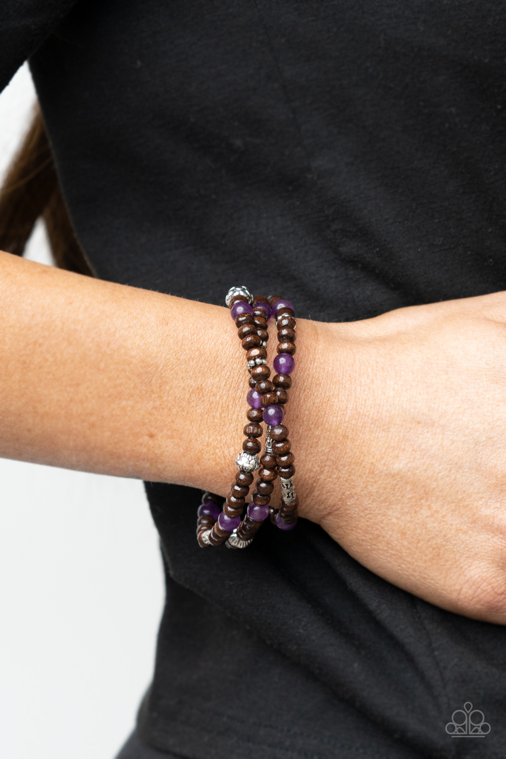 Purple stone and ornate silver beads provide a refreshing accent to triple strands of wooden beads as they layer around the wrist in an air of earthy sophistication. Features a toggle clasp closure.