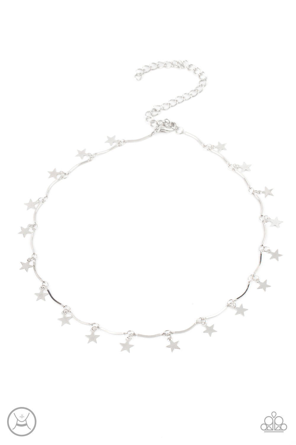 A collection of dainty silver stars and curved silver bars delicately connect around the neck, creating a stellar fringe. Features an adjustable clasp closure.