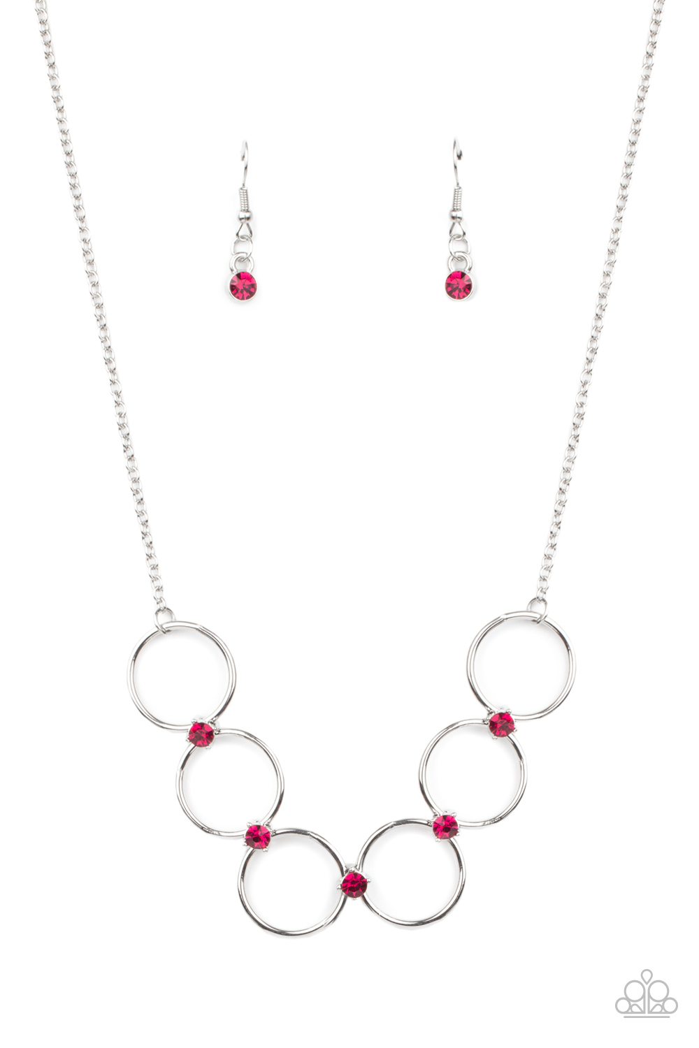 Glittery pink rhinestones link a dainty row of silver rings below the collar, creating a regal minimalist inspired display. Features an adjustable clasp closure.