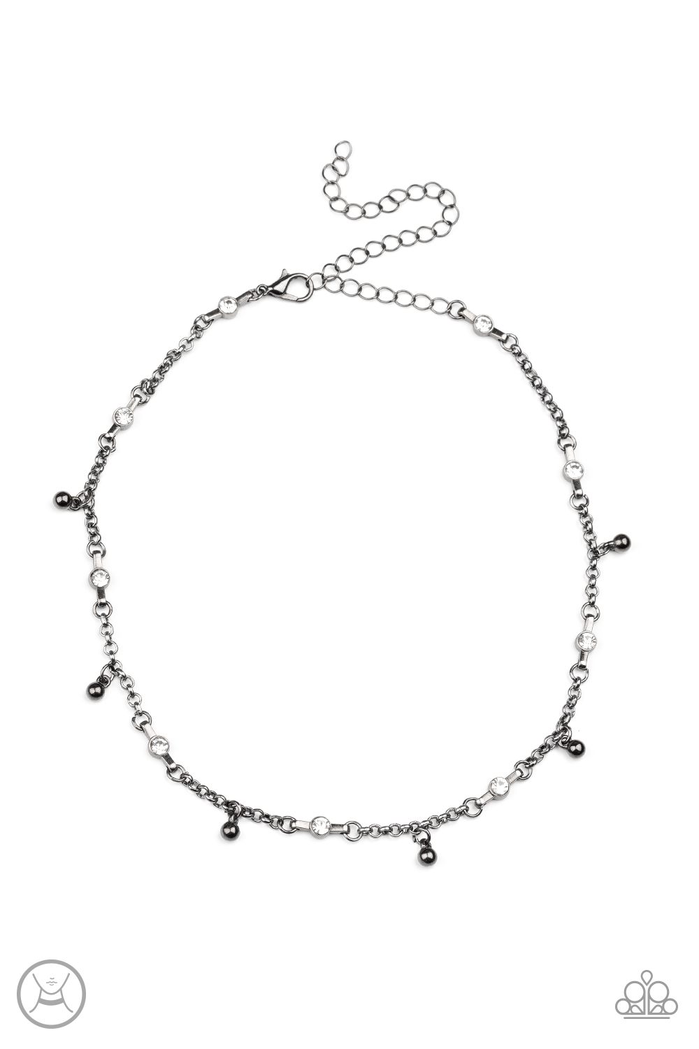 Featuring sleek fittings, dainty white rhinestones link with sections of glistening gunmetal chain around the neck. Shiny gunmetal beads dangle from the chain for a flirtatious finish. Features an adjustable clasp closure.