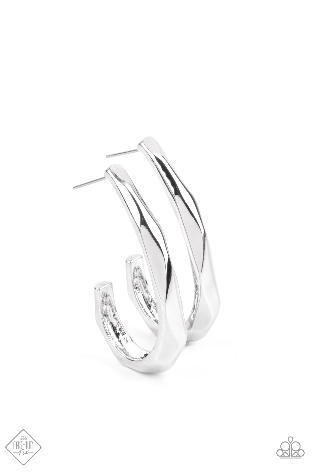 The surface of a J-hook shaped silver hoop is faceted in a flashy finish that reflects and refracts the light for an edgy shimmer. Earring attaches to a standard post fitting. Hoop measures approximately 1" in diameter.