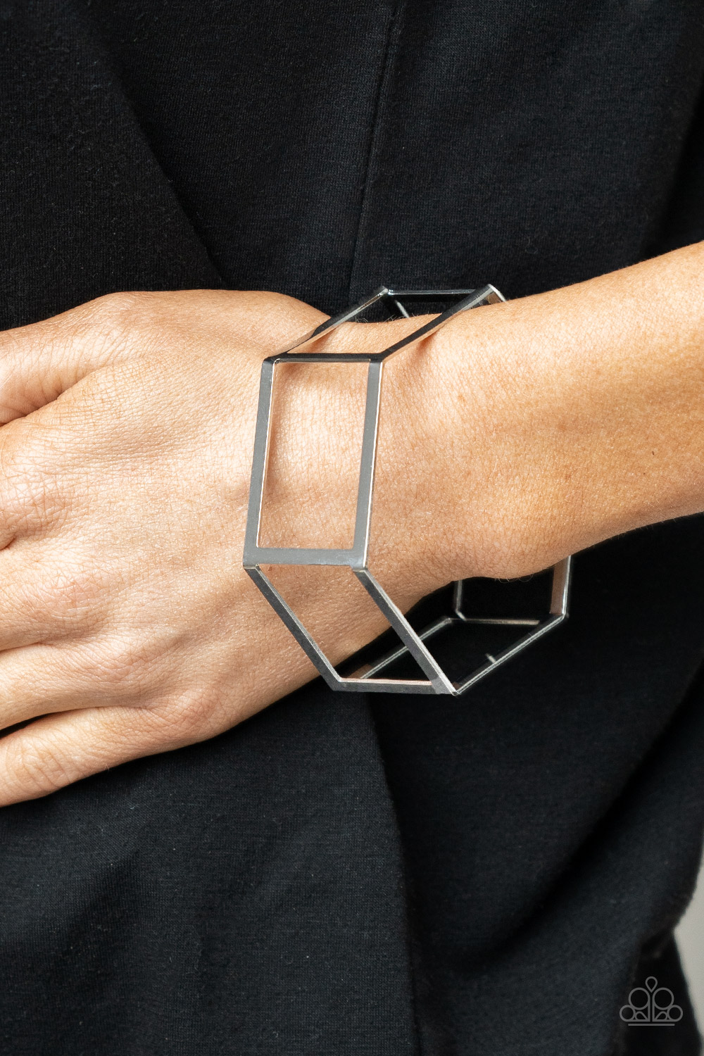 A row of airy silver rectangular frames delicately bend into a hexagonal cuff, creating an edgy centerpiece.