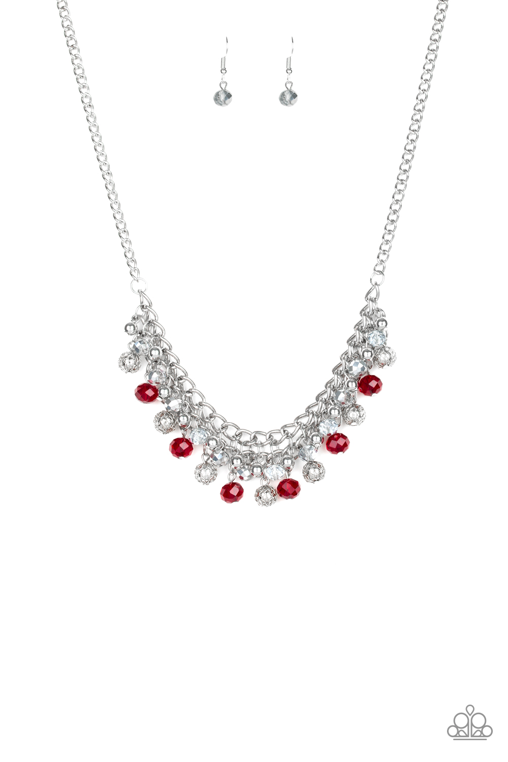 A collection of metallic net covered beads, shiny silver beads, and glittery red and metallic flecked crystal-like beads swing from the bottom of interlocking silver chains, creating a refined fringe below the collar. Features an adjustable clasp closure.
