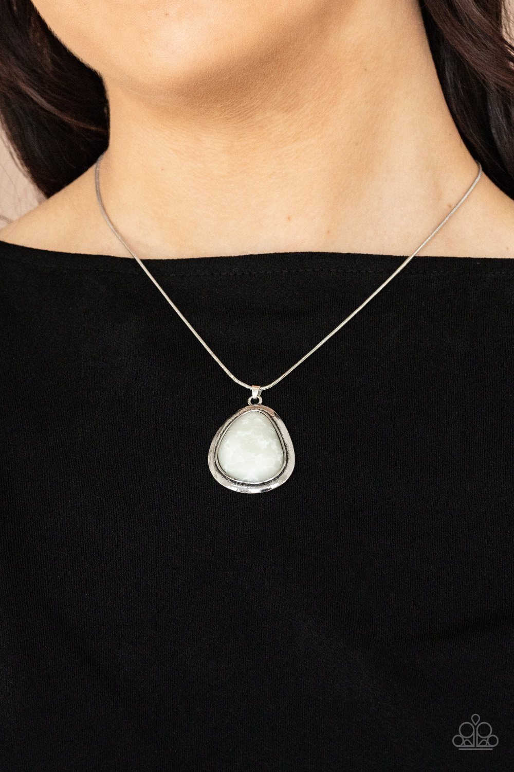A marbled white stone is encased in a simple asymmetrical silver teardrop frame. The earthy pendant falls below the collar creating a natural and enduring impact. Features an adjustable clasp closure.