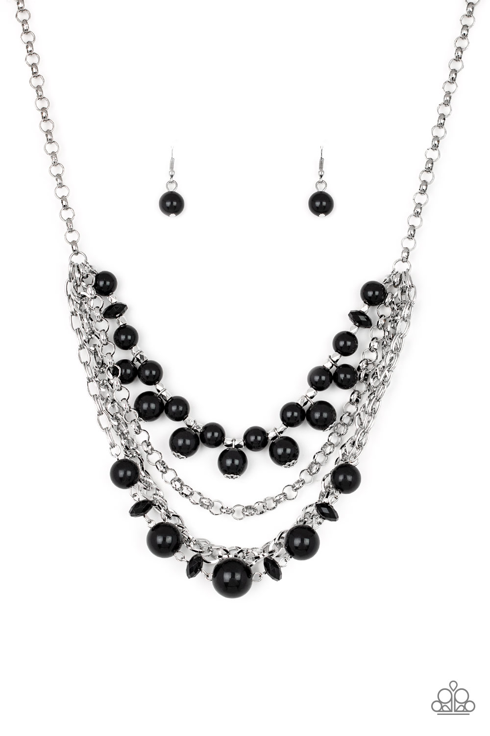 Varying in size, black beads, black crystal-like beads, and faceted silver beads join with mismatched silver chains below the collar, creating a radically refined fringe. Features an adjustable clasp closure.