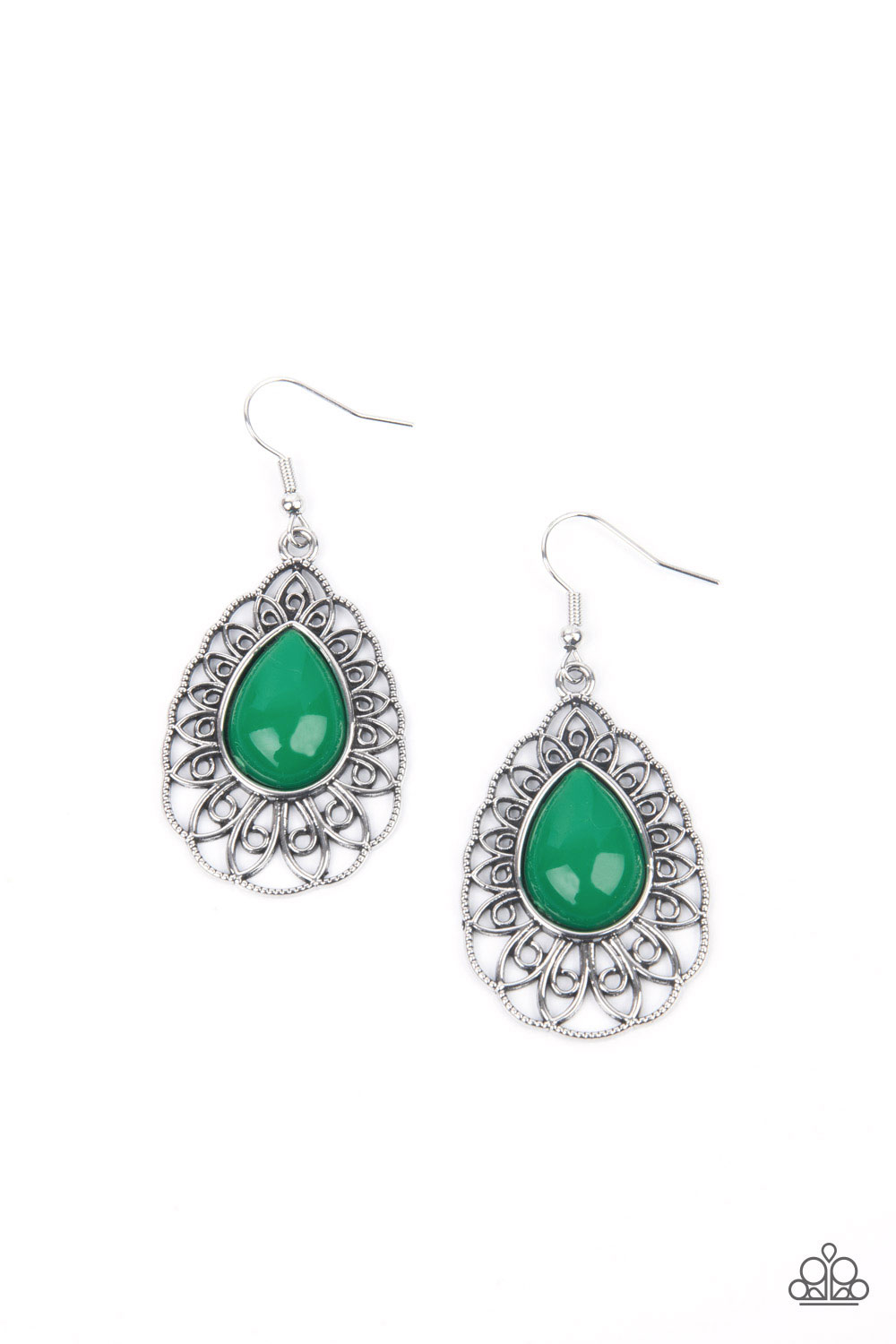 A shiny Mint teardrop bead is pressed into the center of an airy silver teardrop frame radiating with ornate petals for a whimsical finesse. Earring attaches to a standard fishhook fitting.