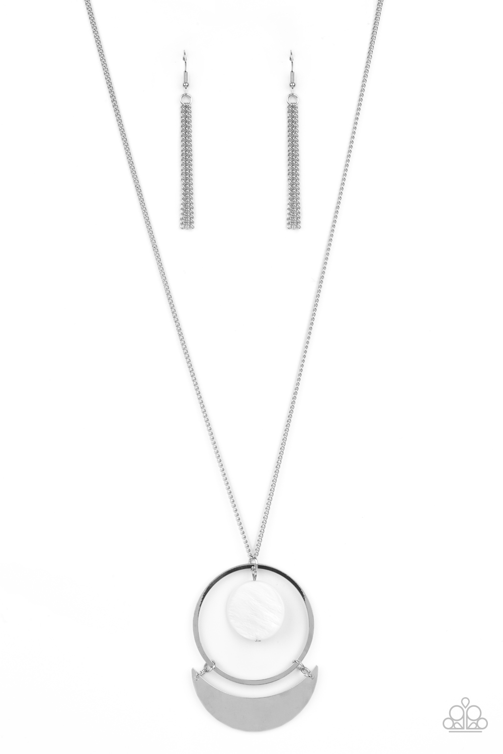 A white shell-like disc swings from the top of a flat silver hoop at the bottom of a lengthened silver chain. A flat silver crescent frame swings from the bottom of the display, creating a sleekly stacked pendant. Features an adjustable clasp closure.