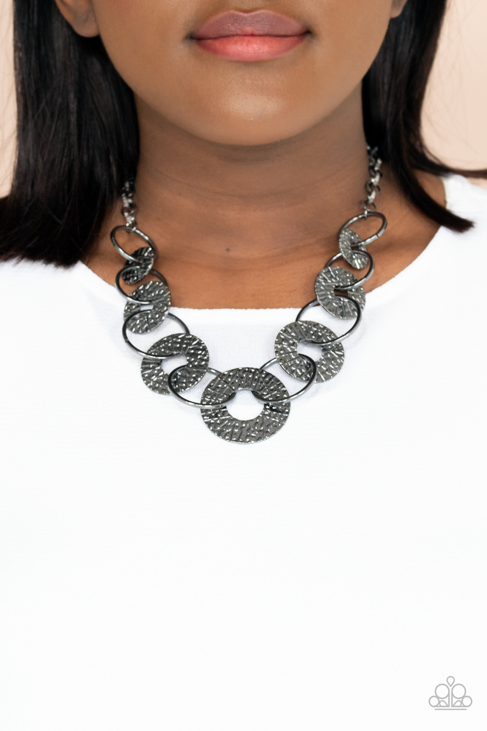 Gradually increasing in size near the center, a collection of glistening gunmetal rings and abstract hammered discs interlock below the collar for an intense industrial look. Features an adjustable clasp closure.