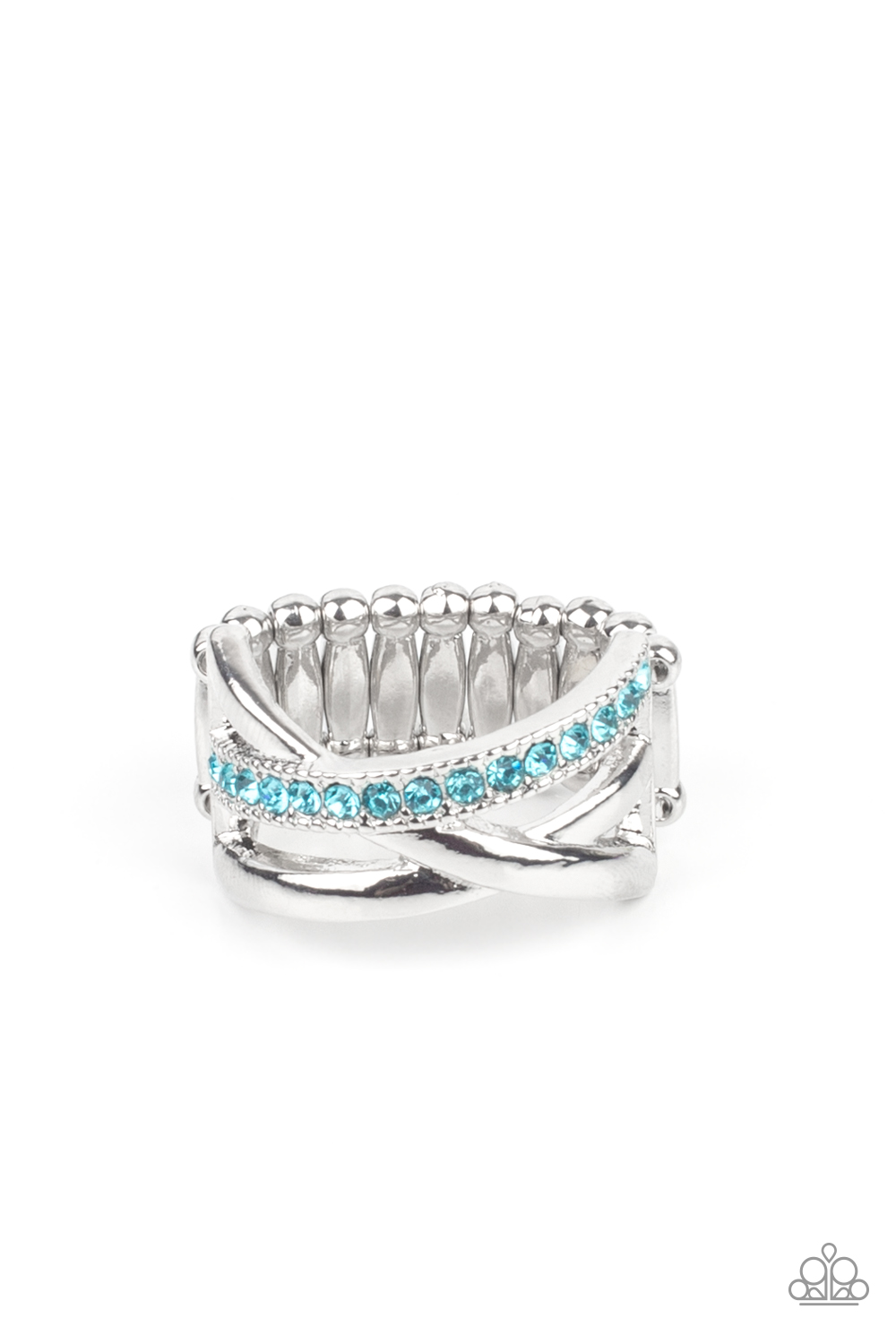 Bands of crisscrossing shining silver rows are highlighted by a row of glittering Aquamarine rhinestones for a ritzy finish across the finger. Features a stretchy band for a flexible fit.