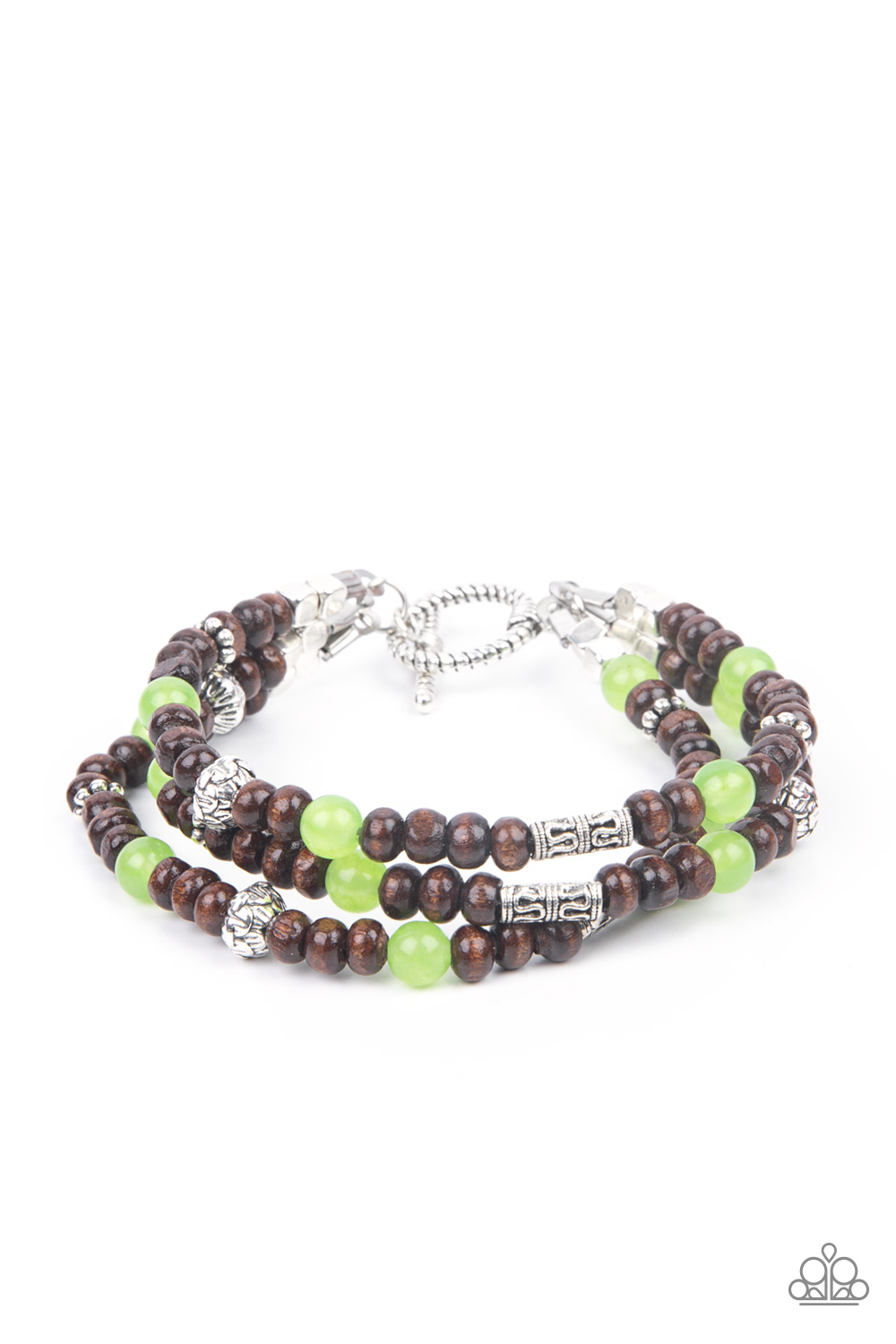 Apple Green stones and ornate silver beads provide a refreshing accent to triple strands of wooden beads as they layer around the wrist in an air of earthy sophistication. Features a toggle clasp closure.