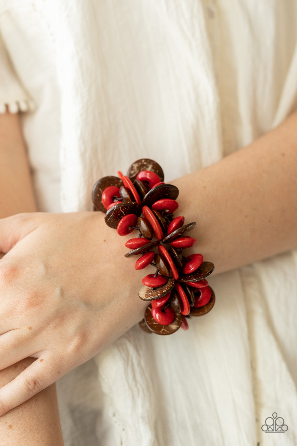 A collection of red and brown disc-shaped wooden beads are threaded along stretchy bands creating a tropical island vibe around the wrist.