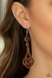 Brown wicker-like laces delicately twist into a knotted frame that attaches to a dainty brown wooden disc, creating an earthy display. Earring attaches to a standard fishhook fitting. Sold as one pair of earrings.