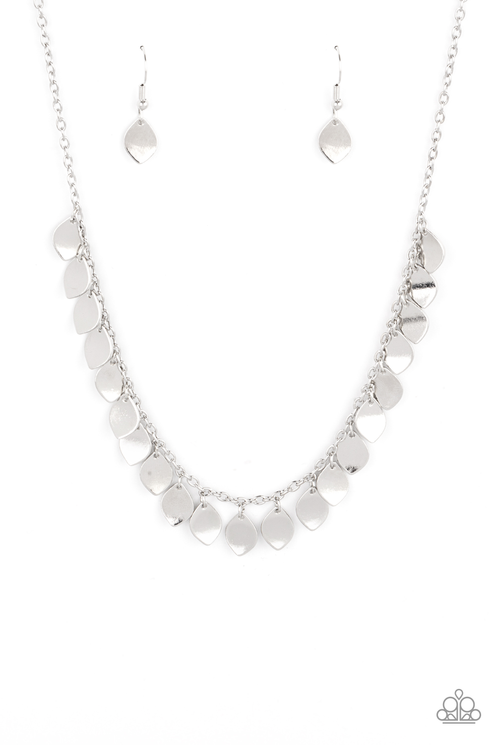 Teardrop silver discs drip from a dainty silver chain, creating a shimmery fringe below the collar. Features an adjustable clasp closure.