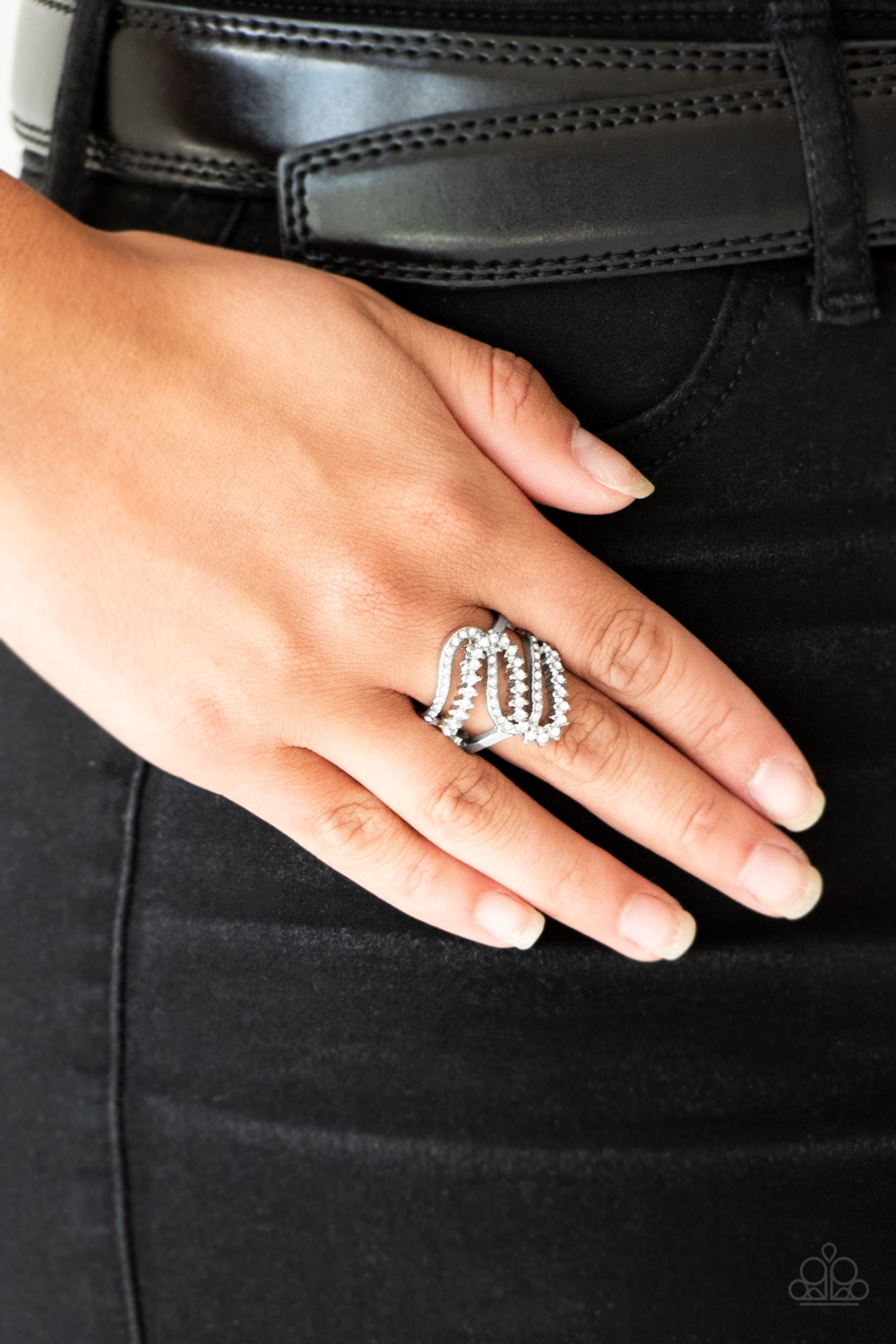 Encrusted in dainty white rhinestones, radiant silver ribbons wave across the finger, coalescing into a whimsical band. Features a stretchy band for a flexible fit.